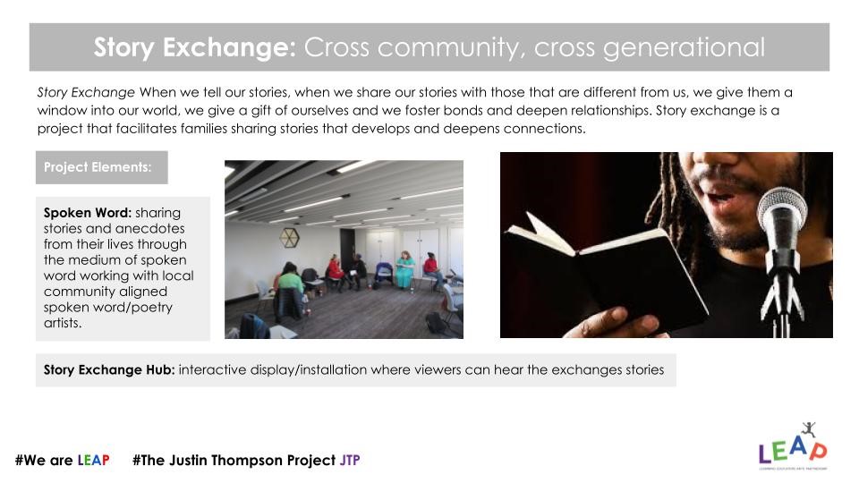 Facilitated exchanges that foster empathy and connection, including spoken word with community aligned poets and an interactive Story Exchange Hub where visitors can listen to recorded stories.