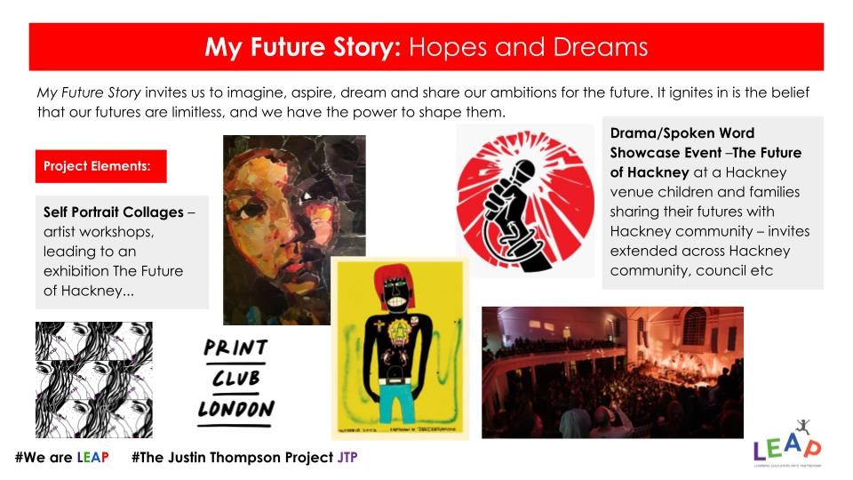 Workshops and self-portrait collages, culminating in The Future of Hackney showcase, an evening of drama and spoken word at Hackney St John's Church where children and families share hopes, plans and possibilities.