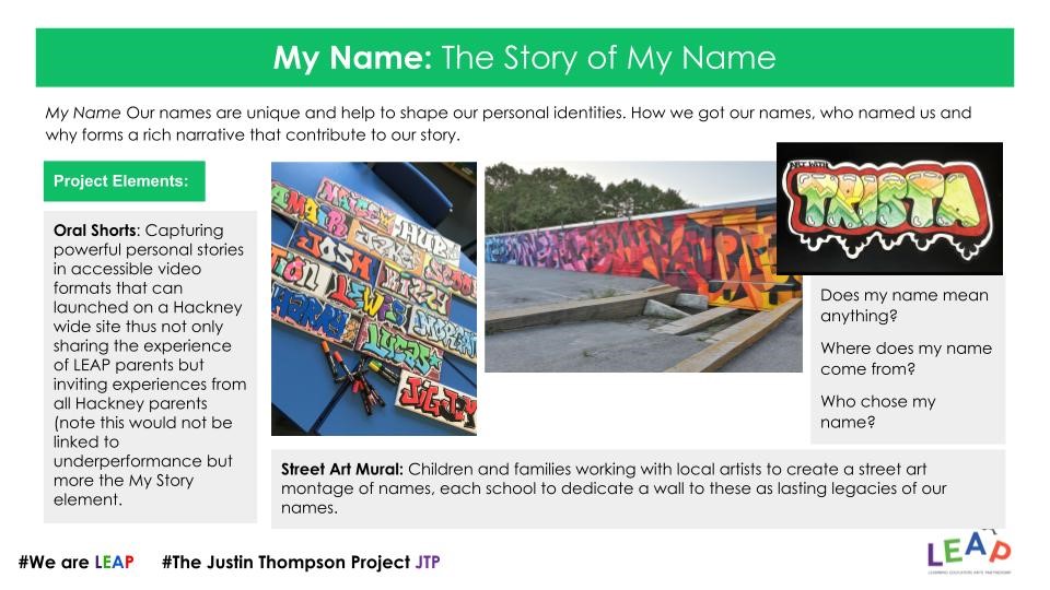 Names hold memory, meaning and identity. Families explore the origins of their names and collaborate with local artists to create a street-art montage at each school, a lasting, public celebration of belonging.